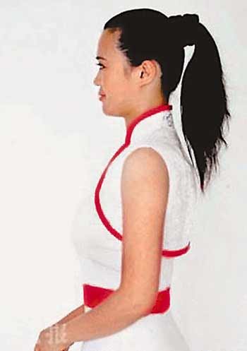 這款比較突出大的包發,突出飽滿的熱情。此外,發型的線條動感十足,和旗袍的風格也比較一致。另外,發型師特別搭配了奧運五環的小配飾,使發型脫離了單調的感覺,又體現了奧運元素。這個小飾品別在頭的側面,頒獎時觀眾很容易看到。