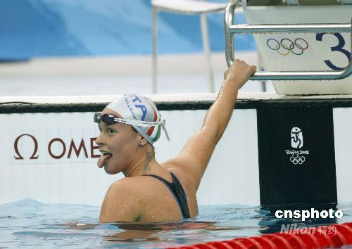 8月13日,在北京奧運會女子200米自由泳決賽中,意大利選手費代麗卡·佩萊格里尼以1分54秒82的成績獲得金牌,并打破世界紀錄。圖為她在泳池以吐舌獨特的方式慶祝勝利。中新社發 杜洋 攝