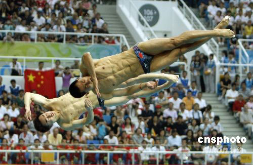 8月13日下午,北京奧運(yùn)會(huì)男子雙人三米跳板決賽,中國組合秦凱/王峰技?jí)喝盒郏瑠Z得冠軍,為中國奧運(yùn)軍團(tuán)摘取第16塊金牌。中新社發(fā) 杜洋 攝