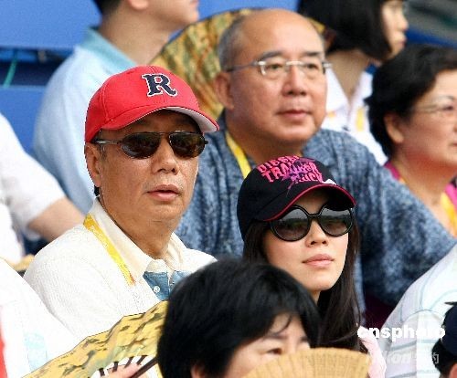 8月13日,2008北京奧運棒球賽在五棵松體育中心舉行中華臺北隊對戰荷蘭隊,郭臺銘(左)和妻子曾馨瑩也到場看球。中新社發 CNAsports 攝
