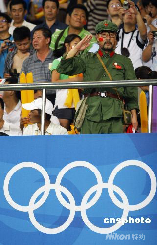 8月13日,北京奧運會男子足球賽,中國對巴西的比賽在秦皇島奧體中心舉行,最終中國隊0:3負于巴西隊。圖為一位身著老式“軍裝”的球迷亮相秦皇島奧體中心。 中新社發 劉新 攝