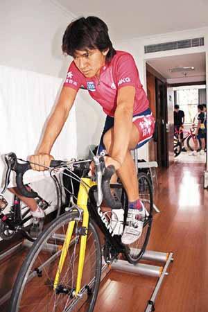 按計劃,“阿寶”與黃蘊瑤今天本應進行公路訓練,但因天雨以及單車館內有其它車隊正在訓練的關系,唯有在室內器械上進行練習。其中“阿寶”邊練邊反復觀看錄像帶!八诳慈ツ辍眠\北京’測試賽的錄像,16日的比賽,我們打算以測試賽的戰術為藍本,他反復地看,已不知看多少次了。”沈教練解釋道。