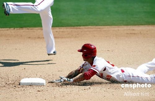 8月15日,北京奧運會棒球男子預賽,中國隊與中華臺北隊的比賽在北京五棵松棒球場舉行,中國隊(白)最終在延長局以8:7戰勝中華臺北隊。中新社發 盛佳鵬 攝