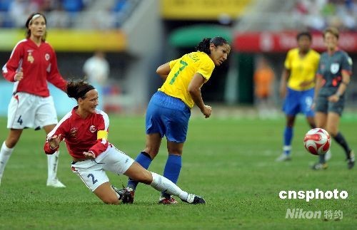 8月15日,奧運女足四分之一決賽在天津奧體中心水滴體育場舉行,由挪威女足對陣巴西隊,巴西上半時7號丹尼埃拉領先一球。中新社發 陳文 攝