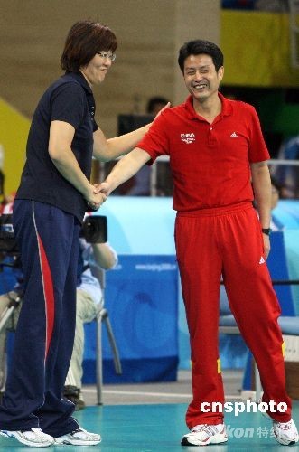 賽后,美國隊(duì)主教練郎平主動上前與中國隊(duì)主教練陳忠和握手。