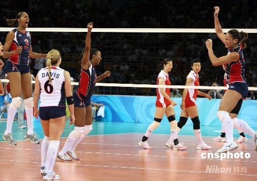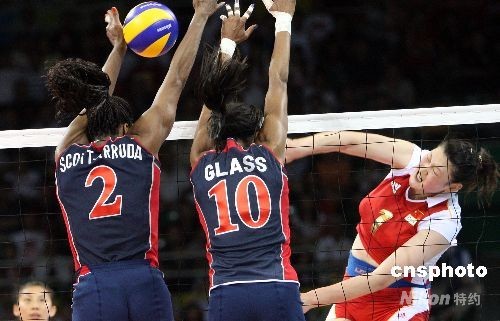 8月15日晚,北京奧運會女排小組賽中國與美國之戰在北京奧運會排球比賽館--首都體育館舉行,這場被戲稱為“和平大戰”的比賽最后時刻,兩名美國選手封死了中國隊王一梅的扣殺而以3比2戰勝中國女排。中新社發 任晨鳴 攝