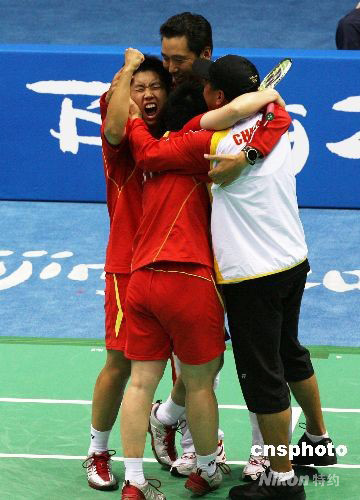 杜婧于洋奪得羽毛球女雙金牌與教練激情擁抱