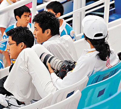 報(bào)道說(shuō),郭晶晶在第三跳前,霍啟剛才于水立方的觀眾席現(xiàn)身,相隔約一、兩分鐘后,朱玲玲和霍啟山也到場(chǎng),三人并肩而坐;魡偙蝗珗(chǎng)記者舉機(jī)狂影,表現(xiàn)甚不自然,反而帶備Canon專業(yè)相機(jī)及長(zhǎng)鏡的朱玲玲則投入其攝影世界,每逢郭晶晶和吳敏霞出場(chǎng),她都即時(shí)舉機(jī)拍照。