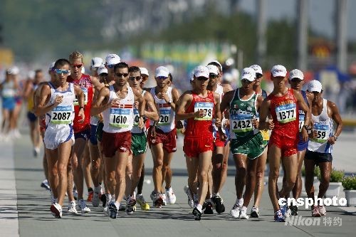 8月16日,北京奧運會田徑比賽第二日,在北京國家體育場進行的男子20公里競走中,俄羅斯選手瓦列里-博爾欽以1時19分01獲得該項目金牌。 銀牌被厄瓜多爾選手赫費爾松·佩雷斯以1小時19分15獲得,銅牌被澳大利亞選手賈里德·塔倫特以1小時19分42秒獲得。 中國三名選手王浩、禇亞飛與董吉敏無緣獎牌。中新社發 盛佳鵬 攝