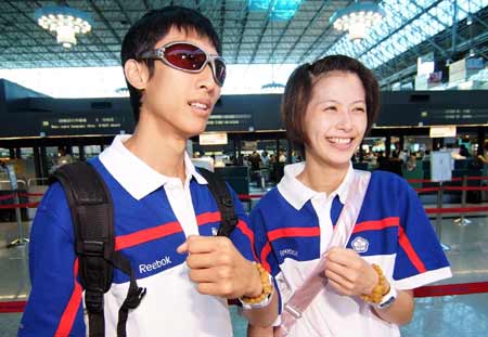 中華臺北跆拳道奧運選手朱木炎(左)、楊淑君是一對情侶,這對“神雕俠侶”再搭機前往北京參賽時,兩人在機場都秀出日前求來的佛珠,希望一路平安、比賽順利。(下圖)