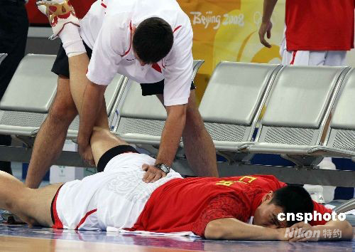 8月16日,北京奧運會男子籃球小組賽第四輪比賽在五棵松籃球館舉行,為了爭奪小組出線權(quán)而躋身八強之列,由姚明率領(lǐng)的中國隊與由諾維斯基、卡曼率領(lǐng)的德國隊展開“生死大戰(zhàn)”之前兩小時,中國隊就到達賽場,姚明在場地內(nèi)一邊“偷窺”德國隊的訓練,一邊接受火箭隊隊醫(yī)的專門治療。中新社發(fā) 任晨鳴 攝