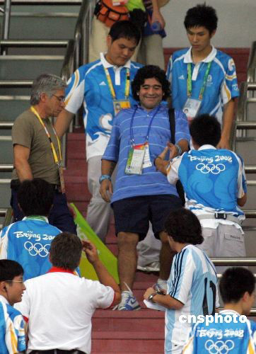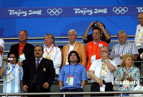 8月16日,北京奧運會男足,阿根廷VS荷蘭的比賽在上海體育場進行。球王馬拉多納親臨上海為阿根廷加油助威。中新社發(fā) 湯彥俊 攝