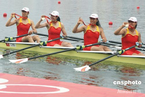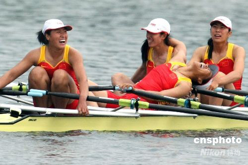 8月17日下午,中國組合唐賓、金紫薇、奚愛華、張楊楊在北京奧運(yùn)會(huì)賽艇女子四人雙槳決賽中以6分15秒95的成績超越英國、德國等世界名將獲得冠軍,取得了歷史性的突破。英國隊(duì)獲得亞軍,德國隊(duì)獲得季軍。 中新社發(fā) 任晨鳴 攝