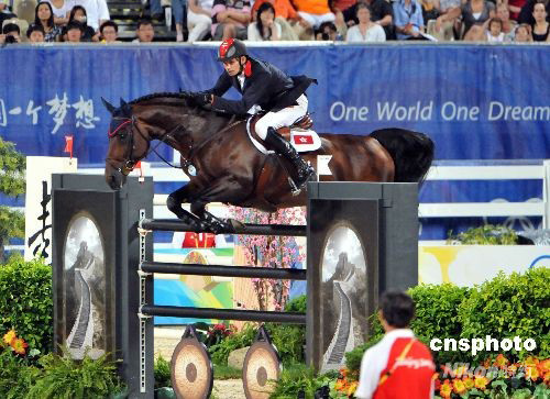 中國選手張濱駕坐騎“科爾蒂斯”上陣,飛躍障礙。 中新社發 洪少葵 攝