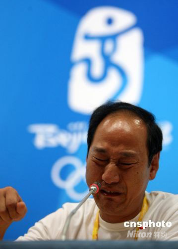 8月18日上午,在北京奧運男子110米欄第1輪第6組比賽中,集十幾億人“寵愛”為一身的中國選手劉翔在第一次起跑后因腿傷遺憾退出比賽。賽后,教練孫海平說道劉翔的傷病與毅力,泣不成聲。中新社發 任晨鳴 攝
