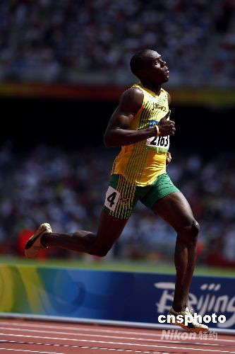 8月18日,北京奧運會男子200米預賽在北京國家體育場“鳥巢”舉行,剛拿到奧運百米冠軍的牙買加選手博爾特輕松晉級下一輪比賽。 中新社發 盛佳鵬 攝