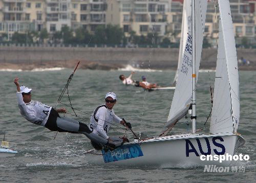 8月18日,北京2008奧運帆船比賽在青島分賽場舉行,澳大利亞隊內森·威爾莫特、馬爾科姆·佩奇組合和埃莉斯·雷基基、特莎·帕金森組合分獲男子雙人艇四七0級和女子雙人艇四七0級冠軍。中新社發 趙振清 攝