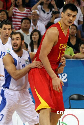 北京奧運會男子籃球小組賽第五輪比賽8月18日在五棵松籃球館舉行,由姚明統率的中國隊與世界勁旅希臘隊為八強位置展開激戰,最終,實力不足的中國隊以77比91告負;昔日與姚明在NBA火箭隊搭檔的斯潘諾理斯指揮球隊嚴密防守姚明,并砍下全場最高的19分。中新社發 任晨鳴 攝