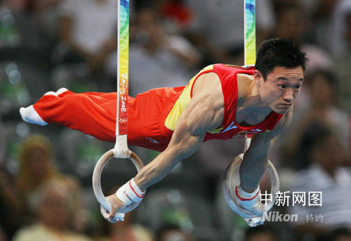8月18日,中國選手楊威在北京奧運會吊環決賽中表現出色,奪得銀牌。中新社記者 武仲林 攝