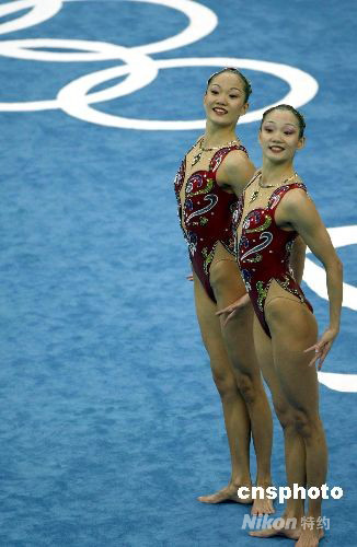 8月18日,北京奧運會花樣游泳比賽在“水立方”拉開帷幕,在首場比賽雙人技術自選項目中,中國選手蔣文文、蔣婷婷以48.084的總分排名第四位。 中新社發 杜洋 攝