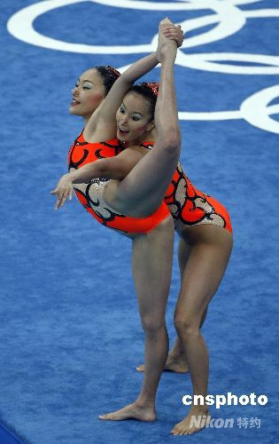 8月18日,北京奧運會花樣游泳比賽在“水立方”拉開帷幕,在首場比賽雙人技術自選項目中,日本選手原田早穗、鈴木繪美子以48.250的總分排名第三位。中新社發 杜洋 攝