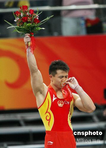 圖:陳一冰、楊威分獲奧運會男子吊環(huán)金銀牌