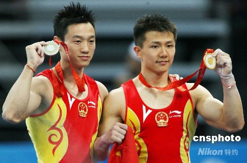 8月18日,中國選手陳一冰(右)在北京奧運會男子吊環(huán)決賽中以16.6分的成績奪得金牌,另一位中國選手楊威獲得銀牌。 中新社發(fā) 武仲林 攝