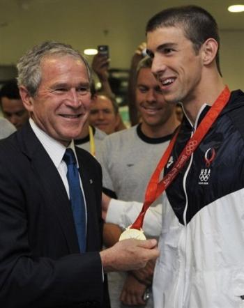 美國(guó)總統(tǒng)布什接見(jiàn)菲爾普斯時(shí)喜笑顏開(kāi)。
