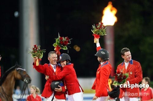 八月十八日晚,美國隊獲得奧運馬術場地障礙賽團體金牌,笑逐顏開登上領獎臺。當日,奧運馬術比賽在香港沙田進行場地障礙賽團體決賽,決出奧馬第四塊金牌。中新社發 洪少葵 攝
