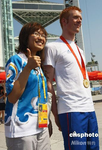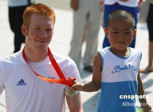 8月19日,獲得北京奧運會自行車團體追逐賽冠軍的英國自行車運動員在奧林匹克公園內接受媒體采訪,大批觀眾、游客和志愿者紛紛上前與其合影。而英國自行車運動員也依然沉浸在獲得金牌的喜悅中,做起了“模特”。 中新社發 劉新 攝