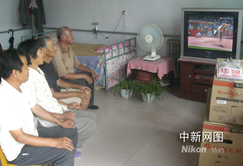 宋愛民鄉鄰正在她家觀看奧運比賽(中間2人是她的父母)。崔志平 攝