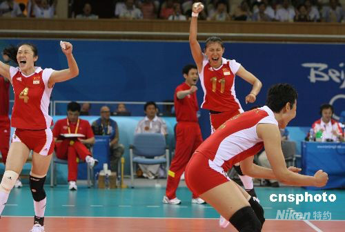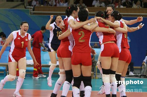8月19日晚,中國女排在奧運會四分之一決賽中,以3:0戰勝俄羅斯晉級四強,隊員歡慶勝利。 中新社發 武仲林 攝