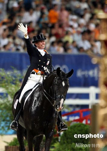 八月十九日晚,荷蘭選手安基·范格林斯芬駕坐騎“薩林雷羅”,在香港沙田奧運馬術盛裝舞步個人賽(大獎賽自選動作)上,技壓群雄,獲得金牌。 中新社發 洪少葵 攝
