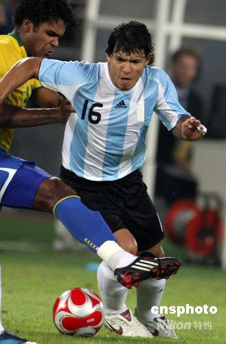 8月19日晚,北京奧運會男足第二場半決賽在北京工人體育場舉行,阿根廷、巴西兩支強隊提前相遇,最終阿根廷隊以3比0完勝巴西隊,進入決賽。 中新社發 任晨鳴 攝