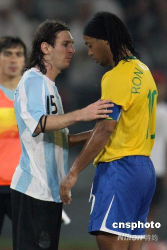 8月19日晚,北京奧運會男足第二場半決賽在北京工人體育場舉行,由球星梅西領(lǐng)銜的阿根廷隊以3比0淘汰巴西隊進(jìn)入決賽。賽后,梅西與巴西隊隊長羅納爾迪尼奧擁抱并安慰這位好友。 中新社發(fā) 任晨鳴 攝