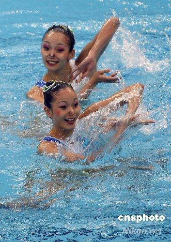 8月20日,北京奧運會花樣游泳雙人項目比賽全部結束,中國組合蔣婷婷/蔣文文的總成績為96.334分,位列第四,創造了中國花樣游泳在奧運會上的最好成績。俄羅斯組合阿納斯塔西婭·達維多娃/阿納斯塔西婭·葉爾馬科娃以總分99.251分奪金。西班牙組合安德魯·富恩特斯/赫瑪·門瓜爾以總分98.334分獲銀牌。日本組合原田早穗/鈴木繪美子總分為97.167分獲銅牌。中新社發 杜洋 攝