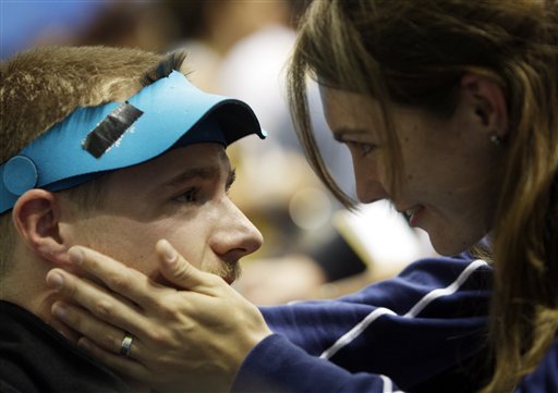 全場(chǎng)愕然。一個(gè)令人難忘的畫(huà)面出現(xiàn)了:埃蒙斯的妻子卡特琳娜先是茫然,然后眼神柔和下來(lái),探身上前,將埃蒙斯攬?jiān)趹牙铩R粫?huì)兒,埃蒙斯回過(guò)神來(lái),與其他射手和裁判打過(guò)招呼,走出去,中途不停地接受記者的問(wèn)詢(xún)。埃蒙斯還帶著笑容,雖然有些苦澀。