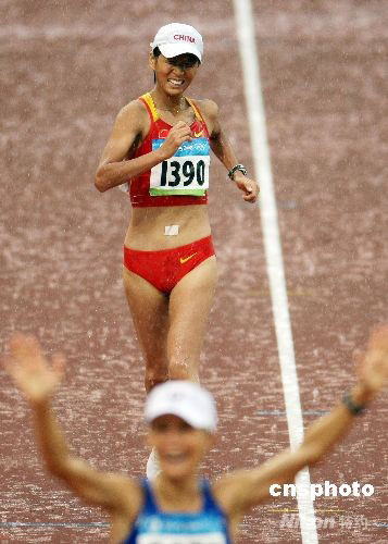北京奧運會女子20公里競走8月21日上午在大雨中舉行,中國選手劉虹最終成績為1小時27分17秒,名列第四,無緣獎牌。中新社發 任晨鳴 攝