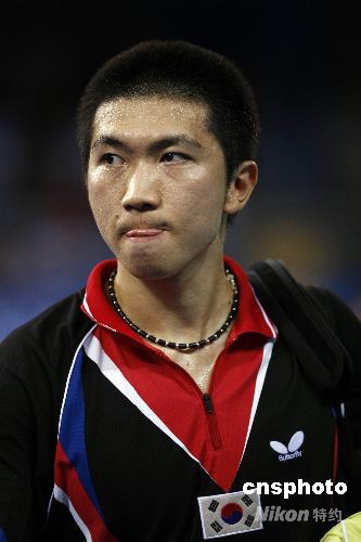 8月21日,北京奧運(yùn)會(huì)乒乓球男子單打第三輪的比賽在北京大學(xué)體育館進(jìn)行,中國香港選手高禮澤4比2戰(zhàn)勝韓國名將柳承敏晉級(jí)下一輪比賽。中新社發(fā) 盛佳鵬 攝