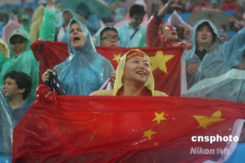 8月21日,中國選手田佳、王潔在奧運沙灘排球決賽中以0 :2負(fù)于美國選手克麗·沃爾什、米絲蒂· 梅—特雷納,獲得亞軍。圖為觀眾冒雨為運動員助威。中新社發(fā) 武仲林 攝