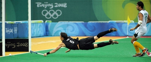 8月21日,在北京奧運會男子曲棍球賽場上,新西蘭隊迎戰巴基斯坦,最終新西蘭隊以4:2獲勝。圖為新西蘭一名隊員飛身擊球。