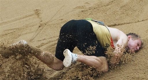 8月21日,一位選手在奧運會男子三級跳的比賽中動作失誤,跌落沙坑。