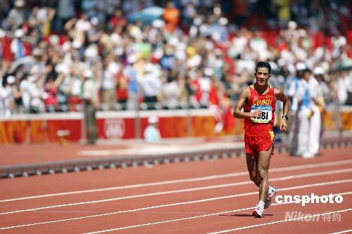 8月22日上午,北京奧運男子50公里競走比賽中,意大利選手亞歷克斯-施瓦策以3小時37分09秒奪得冠軍。中國選手李建波雖奮力追趕,但還是無緣獎牌。 中新社發 盛佳鵬 攝