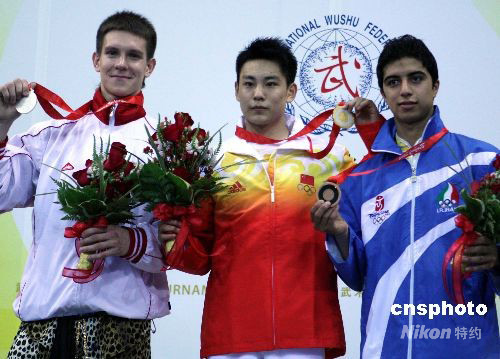8月22日上午,中國運動員袁曉超在北京2008武術比賽男子長拳賽中奪得金牌,俄羅斯、伊朗選手分別獲得銀牌和銅牌。中新社發 宋吉河 攝