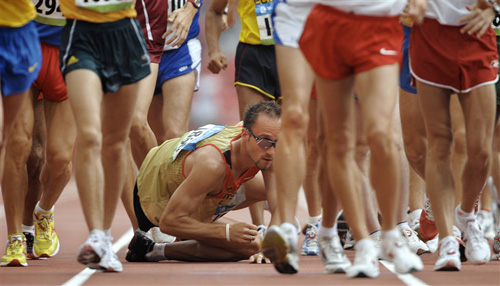 8月22日,北京奧運(yùn)會(huì)田徑男子50公里競(jìng)走在“鳥(niǎo)巢”進(jìn)行,一位選手在比賽中跌倒。