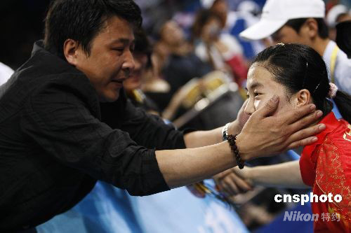 8月22日晚,在北京大學體育館進行的北京奧運會乒乓球女子單打決賽,中國乒乓球老將王楠抱憾負于隊友張怡寧獲得銀牌,在現場觀戰的王楠老公郭斌賽后撫慰愛妻。 中新社發 盛佳鵬 攝