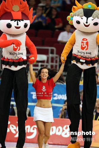北京奧運(yùn)會(huì)男子籃球半決賽8月22日晚在五棵松籃球館開戰(zhàn),深受各國觀眾喜愛的北京奧運(yùn)會(huì)吉祥物“福娃”表演踩高蹺為比賽助陣。中新社發(fā) 任晨鳴 攝
