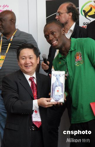 圖:博爾特向中國紅十字基金會捐贈五萬美元