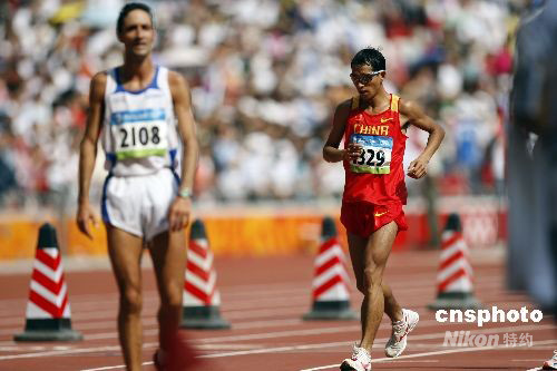 8月24日,北京奧運會田徑比賽的最后一天,在男子馬拉松的比賽中,肯尼亞選手塞繆爾-卡馬烏以2小時06分32秒奪冠,并且打破了奧運會紀錄。銀牌被摩洛哥選手賈瓦德-加里卜以2小時07分16秒奪得,同樣打破了奧運會紀錄,第三名被埃塞俄比亞的策加耶-凱貝德-沃爾多法以2小時10分00秒獲得。中國選手鄧海洋和李柱宏以2小時16分17秒和2小時24分08秒分列第25位和51位。中新社發 盛佳鵬 攝