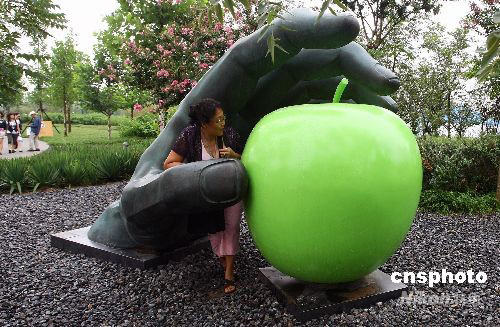 圖:游客與奧林匹克公園內雕塑“親密”合影